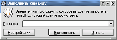 Нажатие комбинации клавиш Alt-F2 вызывает появление маленького окна, в котором вы можете ввести команду, запускающую нужную программу. Учтите, что вы не сможете увидеть текст, выводимый программой после ее запуска из командной строки! Поэтому этот метод рекомендуется только для запуска программ, создающих отдельные окна для работы, или для запуска приложений, не требующих ввода или вывода информации. Для прочих случаев лучше использовать эмулятор терминала.