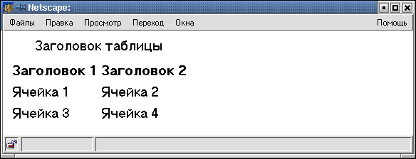 <TABLE> <CAPTION>Заголовок таблицы</CAPTION> <TR><TH>Заголовок 1</TH><TH>Заголовок 2</TH></TR> <TR><TD>Ячейка 1</TD><TD>Ячейка 2</TD></TR> <TR><TD>Ячейка 3</TD><TD>Ячейка 4</TD></TR> </TABLE>