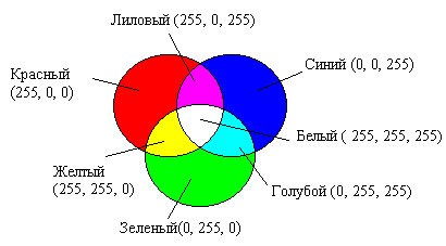 Чем больше значение байта цветовой составляющей, тем ярче этот цвет. При наложении одной составляющей на другую яркость суммарного цвета также увеличивается.