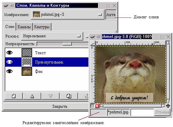 Действительно, однажды начав работать со слоями, вы уже не сможете от них отказаться. Они являются, наверное, самым важным инструментом при работе с графикой в GIMP. Все основные приемы работы -- создание тени, рельефа, шаблонов, анимации и т. д. -- все это базируется на работе со слоями.