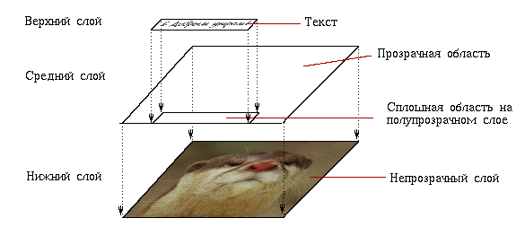 На представленном рисунке нижний, полностью непрозразный слой -- это исходное изображение. Средний слой имеет такие же размеры, как и предыдущий, но этот слой уже прозрачный. У нанесенного на него белого прямоугольника параметр непрозрачности относительно нижнего слоя порядка 50%. И, наконец, у верхнего слоя с текстом размеры меньше, чем у всех предыдущих слоев и он также имеет прозрачную основу, как и второй слой.