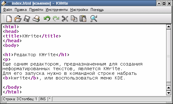Еще одним редактором, предназначенным для создания неформатированных текстов, является KWrite. Для его запуска нужно в командной строке набрать "kwrite" или воспользоваться меню KDE.