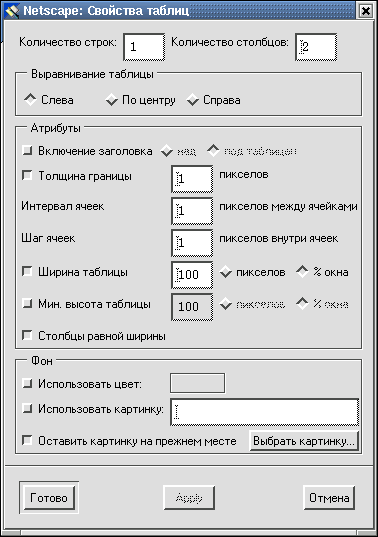 На экране появится окно установки свойств таблицы с тремя вкладками: Таблица, Строка и Ячейка, при помощи которых можно менять параметры таблицы: вставлять и удалять строки, столбцы и ячейки, выравнивать и форматировать содержимое ячеек. Напомним, что для просмотра гипертекстового документа используются браузеры -- специальные программы, предназначенные для этих целей, например, Netscape. |