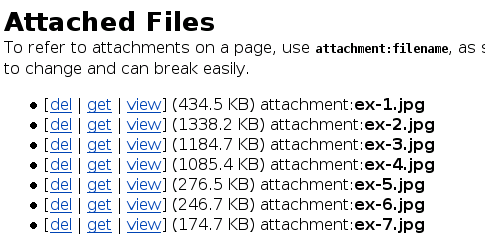To refer to attachments on a page, use attachment:filename.ext; a link of this kind follows all the rules for normal links, i.e. pictures are automatically inlined. Do not use the URL of the [get] link you can see on the attachments upload page, since these links are subject to change and can break easily on reconfiguration of the wiki. To refer to files attached to other pages, use attachment:WikiName/filename.ext.